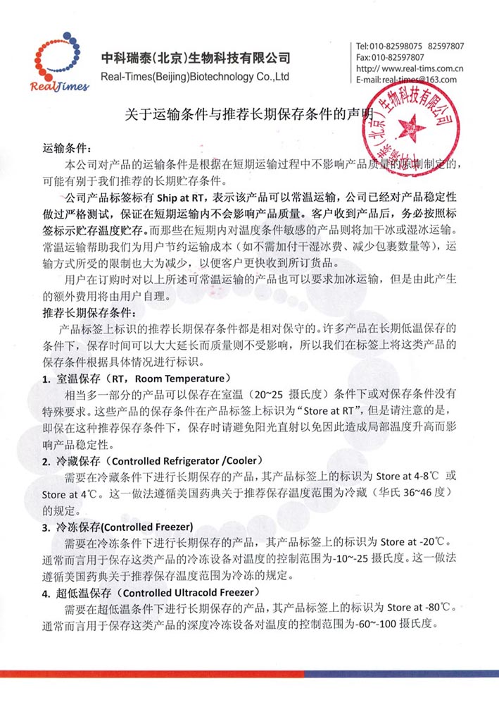 关于运输条件与推荐长期保存条件的声明