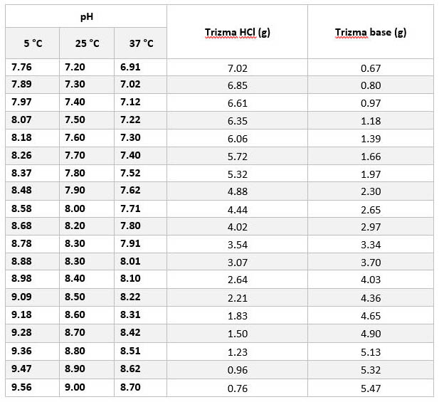 Tris为弱碱,在常温(25℃)下,它的pKa为8.1,根据缓冲理论,Tris缓冲液的有效缓冲范围在pH 7.1到9.1之间。0.1 M的水溶液pH为10.4,一般加入盐酸以调节pH值,即可获得所需pH值的缓冲液。但同时应注意温度对于Tris的pKa的影响对于 Tris 缓冲液,温度每降低 1℃,pH 增加约0.03 个单位,浓度每稀释 10 倍,pH 降低 0.03-0.05 个单位。对于精确应用,使用带有玻璃/甘汞复合电极的经仔细校正的 pH 计。