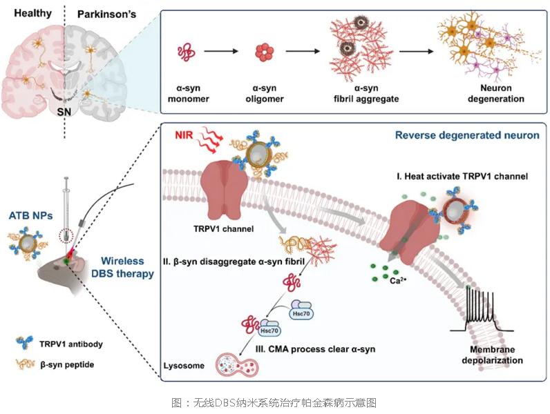基于此,研究团队设计了一种光热无线DBS纳米系统,命名为ATB NPs。这一系统通过直接刺激神经元内源性表达的热敏TRPV1受体,实现对退化神经元的精准调控。该系统由三个核心模块组成:光热转换模块(金纳米壳AuNSs),用于激活热敏TRPV1离子通道;靶向模块(TRPV1抗体),靶向高表达TRPV1受体的多巴胺能神经元;降解模块(β-syn多肽,含近红外响应连接体),通过结合α-syn的非淀粉样蛋白-β成分疏水结构域,降解α-syn纤维。通过立体定位技术将ATB NPs注射至PD小鼠的黑质后,ATB NPs借助TRPV1抗体锚定在多巴胺能神经元表面。在808 nm脉冲近红外激光照射下,ATB NPs作为纳米天线进行光热转换,激活热敏TRPV1受体,引起Ca2+内流和动作电位产生。同时,ATB NPs释放β-syn多肽,并通过激活分子伴侣介导的自噬途径,清除α-syn聚集体,从而减少病理性纤维。最终,ATB NPs恢复了多巴胺能神经元的交互网络及多巴胺释放能力,改善PD小鼠的运动功能。该无线DBS纳米系统的优势主要包括:利用黑质多巴胺能神经元内源性表达的TRPV1受体,无需植入神经电极或进行基因操作;结合近红外激光技术,能够对特定脑区的退行性神经元实现精准的时空调控;无线DBS纳米系统具有良好的生物安全性。这种基于纳米颗粒的无线DBS治疗策略为帕金森病及其他神经退行性疾病的治疗提供了新思路。