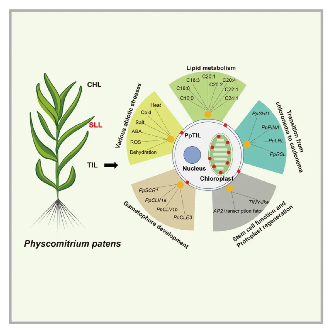研究结果表明,PpTIL与有花植物拟南芥AtTIL的氨基酸序列和蛋白三级结构高度保守。PpTIL基因的表达受高温、低温、盐胁迫、干旱和脱落酸显著诱导,其功能缺失突变体对热胁迫高度敏感,活性氧积累显著增加;而基因过量表达则提升植株的热胁迫耐受性,拟南芥AtTIL基因能回补PpTIL基因缺失突变体的热胁迫敏感表型,表明TIL基因在陆生植物非生物胁迫响应中的功能保守性。与有花植物TIL仅定位于质膜不同,PpTIL在叶绿体和质膜均有定位,且参与调控小立碗藓的多个关键发育过程。在原丝体发育阶段,PpTIL通过参与生长素的生物合成与转运,影响绿丝体向轴丝体的转变。在植株形态建成中,PpTIL参与调控苔藓从二维到三维的生长转变,基因缺失突变体更早形成茎叶体,而过表达植物的茎叶体发育则显著延迟,且成熟后基因缺失和过表达株系的茎叶体数量均显著增加但体积变小,与三维生长标记基因PpSCR1、PpCLV1a/b、PpCLE3等的表达变化高度相关。此外,PpTIL还调控发育相关转录因子的活性,影响植物原生质体的再生与分化过程。