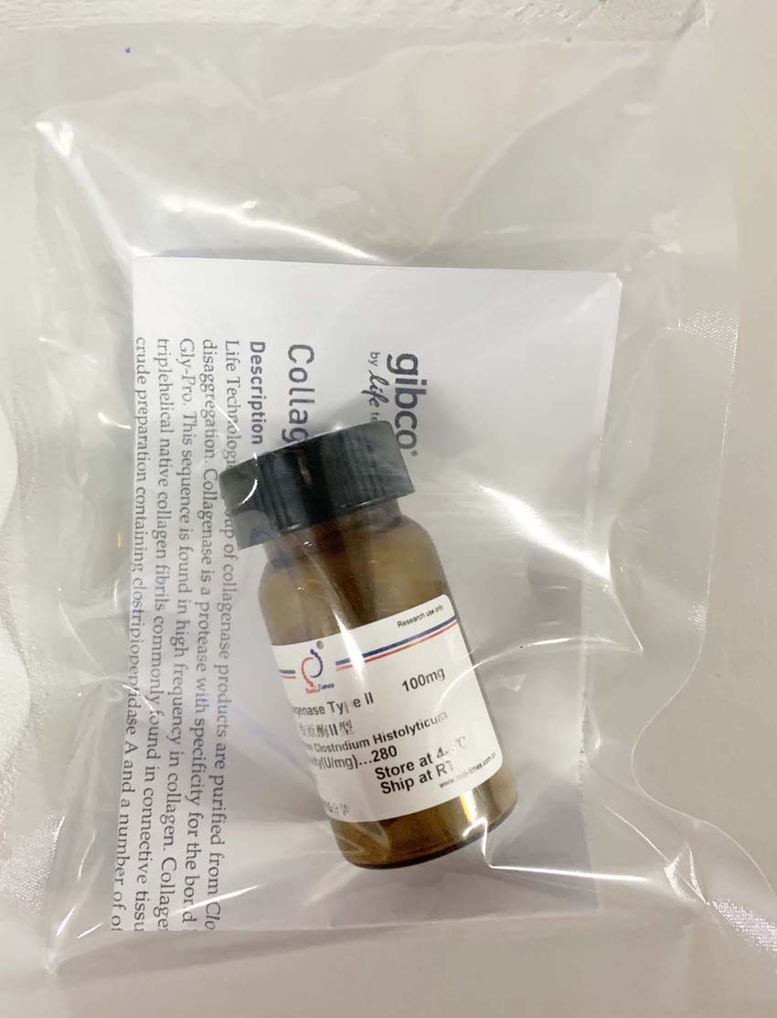说明:Prepared from Clostridium histolyticum for dissociation of tissues. Type II contains higher protease contaminant levels than Type I, especially clostripain and trypsin. Suggested for preparation of cells from liver, bone, thyroid, heart, cartilage, and salivary gland tissue.