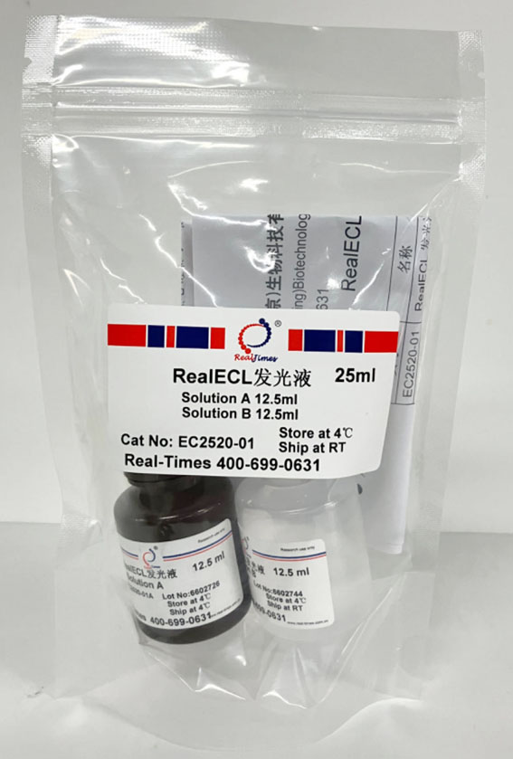 RealECL 是一种超敏ECL化学发光试剂盒,可与二抗上耦连的辣根过氧化物酶(HRP)发生化学反应,发出荧光,从而可以通过用X光片压片或其它适当荧光成像设备检测样品。RealECL具有极高灵敏度和高信噪比,可检测出10-100 fg的微量抗原;发光迅速,荧光可使X感光胶片感光达1小时以上,特别适用于痕量蛋白检测;另外高灵敏度可以大大节省宝贵的样品以及非常昂贵的一抗和二抗的用量,降低实验成本。