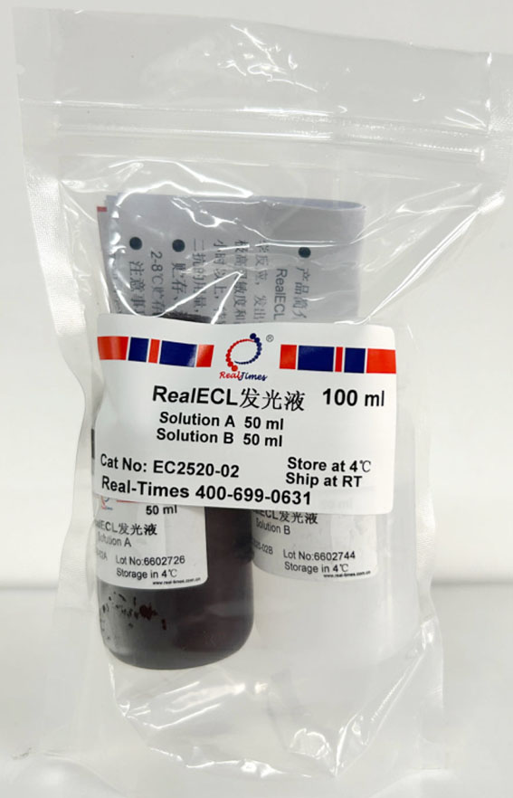 RealECL 是一种超敏ECL化学发光试剂盒,可与二抗上耦连的辣根过氧化物酶(HRP)发生化学反应,发出荧光,从而可以通过用X光片压片或其它适当荧光成像设备检测样品。RealECL具有极高灵敏度和高信噪比,可检测出10-100 fg的微量抗原;发光迅速,荧光可使X感光胶片感光达1小时以上,特别适用于痕量蛋白检测;另外高灵敏度可以大大节省宝贵的样品以及非常昂贵的一抗和二抗的用量,降低实验成本。