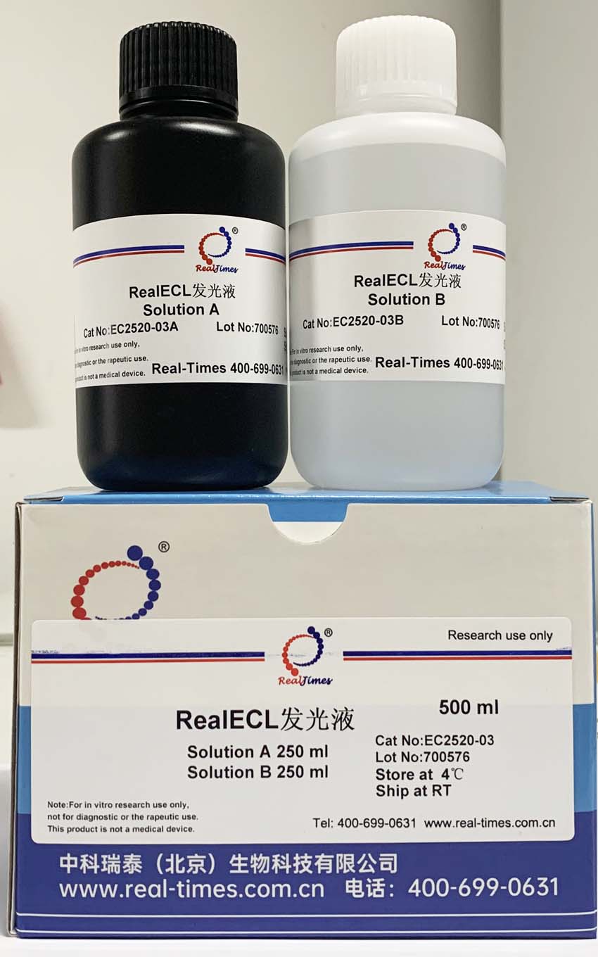 RealECL 是一种超敏ECL化学发光试剂盒,可与二抗上耦连的辣根过氧化物酶(HRP)发生化学反应,发出荧光,从而可以通过用X光片压片或其它适当荧光成像设备检测样品。RealECL具有极高灵敏度和高信噪比,可检测出10-100 fg的微量抗原;发光迅速,荧光可使X感光胶片感光达1小时以上,特别适用于痕量蛋白检测;另外高灵敏度可以大大节省宝贵的样品以及非常昂贵的一抗和二抗的用量,降低实验成本。