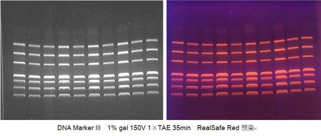 DNA Marker III  1% agarose gel 150V 1×TAE 35min  RealSafe Red预染