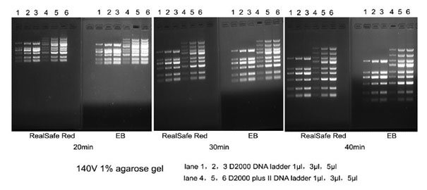 1.1 将RealSafe Red试剂按1:10000溶于琼脂糖凝胶溶液中,充分混匀。(例如:将5 μl RealSafe Red 试剂加入到50 ml 凝胶溶液中)。注:由于RealSafe Red 具有出色的热稳定性,可将试剂直接加入高温的凝胶溶液中,而不用等凝胶溶液冷却后再加入。