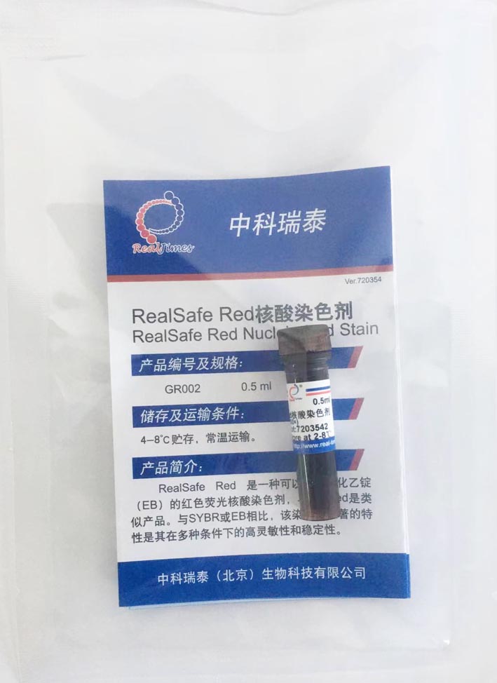 RealSafe Red?是一种可以替代溴化乙锭(EB)的红色荧光核酸染色剂,与GelRed是类似产品。与SYBR或EB相比,RealSafe Red最显著的特性是其在多种条件下的高灵敏性和稳定性。另外相对EB或SYBR,RealSafe Red诱导突变的能力极低。