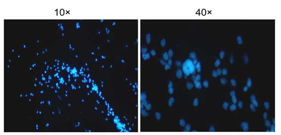 2.2 在适宜于细胞培养的温度下培养20-30分钟。弃染色液,用PBS洗涤2-3次即可进行荧光检测。细胞发生凋亡时,在荧光显微镜下观察会看到凋亡细胞的细胞核呈致密浓染,或呈碎块状致密浓染。