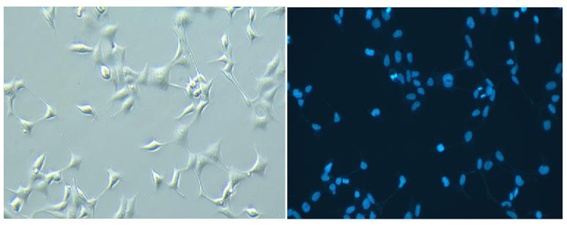 1.2.6 荧光显微镜使用紫外激发,可检测到呈蓝色的细胞核。激发波长350nm左右,发射波长460nm左右。
