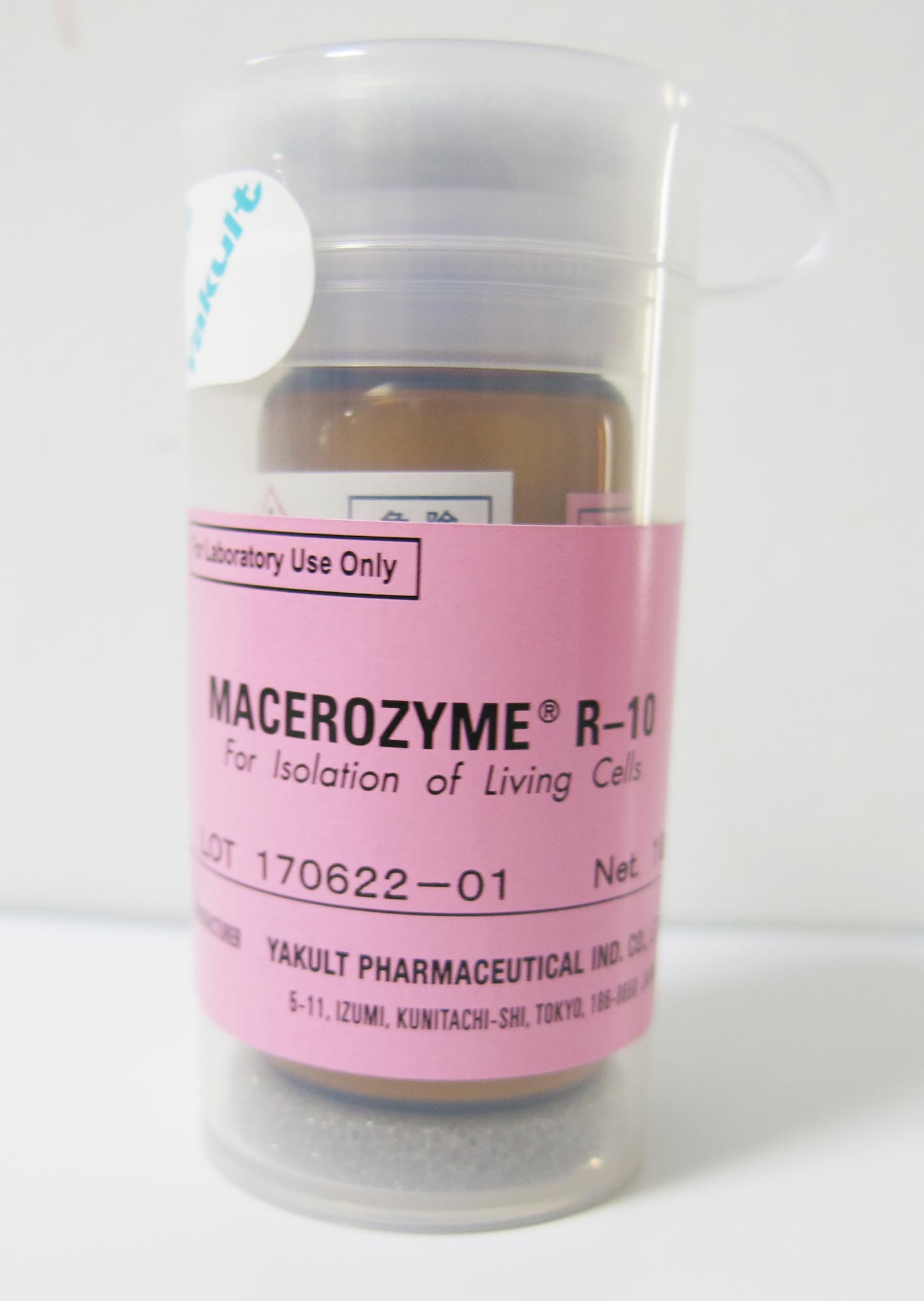 说明:Enzyme derived from Rhizopus sp. Possesses high pectinase and hemicellulase activity. Decomposes plant tissue to isolate single cells. It is often used in combination with cellulose “Onozuka R-10”.