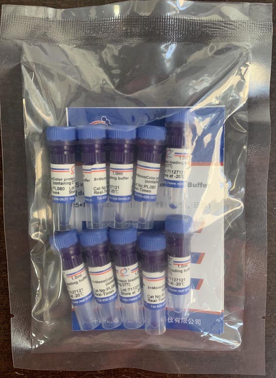 5×SDS-PAGE蛋白上样缓冲液 (还原)是以溴酚蓝为染料,5倍浓缩的SDS-PAGE凝胶电泳上样缓冲液,应用于还原型SDS-PAGE的蛋白样品制备和上样。该缓冲液中含有DTT,可使蛋白质分子的链内二硫键和链间二硫键断裂,通过二硫键连接的各蛋白亚单位彼此分离,经考马斯亮蓝染色以后在电泳凝胶上显现清晰蛋白条带。