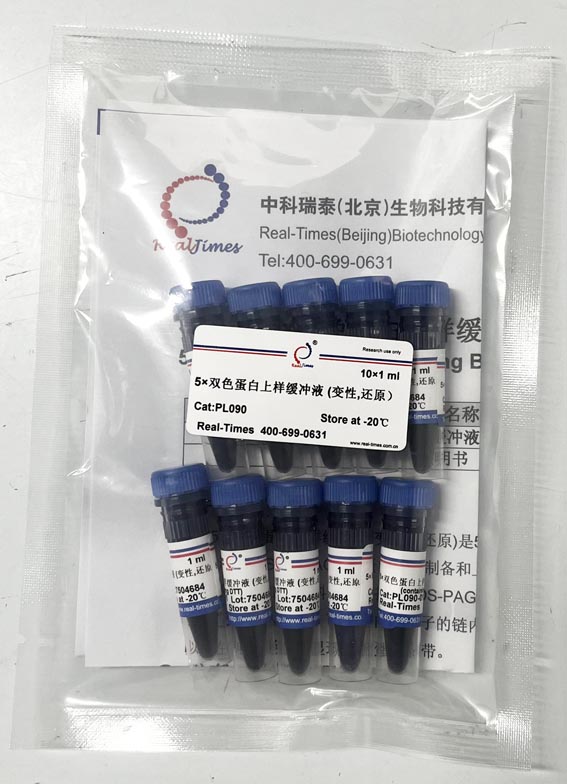 5×双色蛋白上样缓冲液(变性,还原)是5倍浓缩的SDS-PAGE凝胶电泳上样缓冲液,应用于还原型SDS-PAGE的蛋白样品制备和上样。该缓冲液中含有两种示踪染料:蓝色的溴酚蓝和一种红色染料,可以指示SDS-PAGE电泳过程以及Weastern blot的转膜效率。该缓冲液已经加入DTT,可使蛋白质分子的链内二硫键和链间二硫键断裂,经考马斯亮蓝染色以后在电泳凝胶上显现清晰蛋白条带。