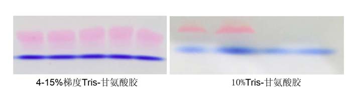 2. 一般说来,电泳中红色染料泳动速度快于溴酚蓝,但在高浓度SDS-PAGE胶中(高于