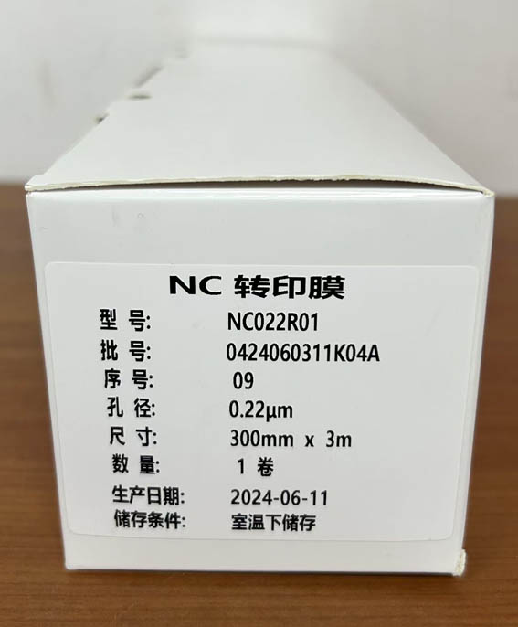 硝酸纤维素膜(Nitrocellulose membrane,NC膜)是蛋白印迹最广泛使用的转移介质,对蛋白有很强的结合能力,而且适用于各种显色方法。具有使用方便,易保存(结合有蛋白的NC膜4℃可保存几年)等优点。NC膜分为0.45μm,0.2μm,0.1μm三种。分子量小于20kD蛋白使用0.2μm,分子量小于7kD蛋白使用0.1μm。本公司产品为孔径0.22μm NC膜。