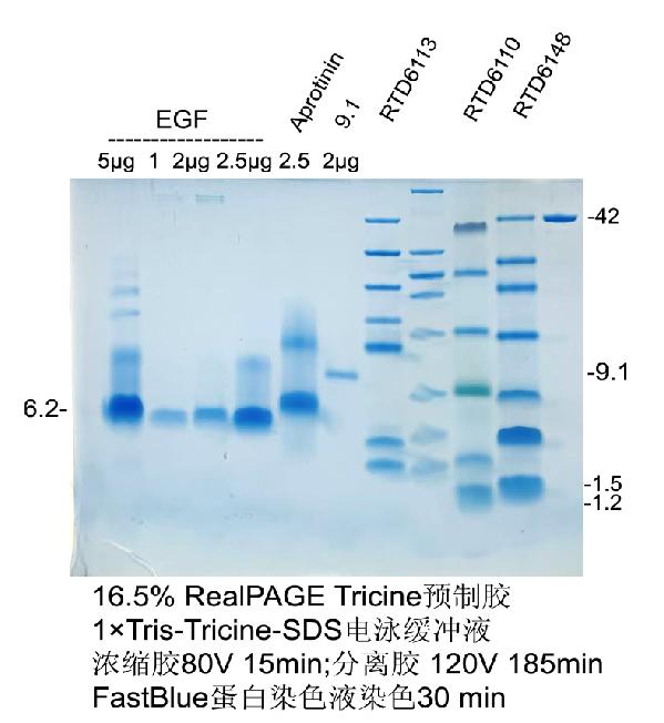 RealPAGE Tricine预制胶可以用来检测2.5-40 kD的多肽大小。预制胶玻璃板尺寸10×8.2 cm,凝胶尺寸8.2×7.2 cm,凝胶厚度1.1