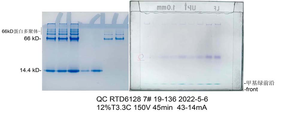 本产品是2种高纯蛋白混合物,在碱性非变性电泳中分子量为为14.4kD66kD,经过非变性电泳后,用考马斯亮蓝染色后可以得到分布均匀密度相近的2条带。