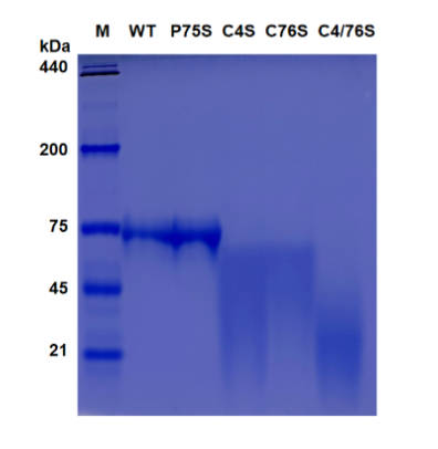 单体蛋白分子量为75 kD,在Tris-甘氨酸非变性下表现为分子量~75 kD,同时会形成少量二聚体(dimer)
