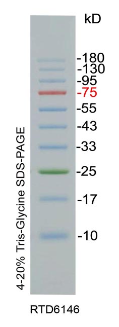 本产品包含10种纯化的预染蛋白质组成,分子量范围为10-180 kD,其中75 kD条带为红色,25 kD条带为绿色,其余条带为蓝色,可以用于SDS-PAGEWestern Blot转膜时确定未知蛋白的分子量。