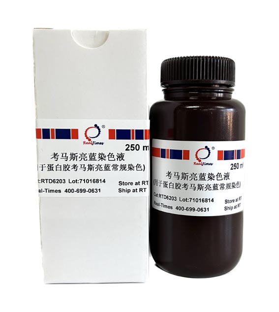 考马斯亮蓝染色液(Commassie Blue Staining Solution)是以考马斯亮蓝G-250为主要成分,采用新配方配置而成。可用于SDS-PAGE或非变性PAGE胶(native