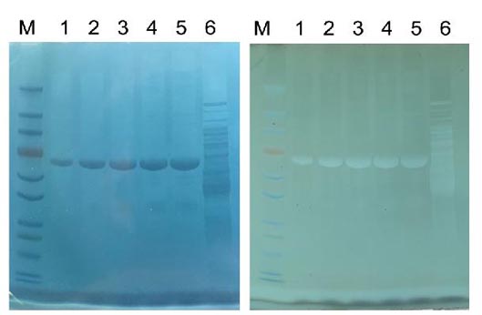 可见光灯箱观察(凝胶底部打光),蛋白质条带反显白色(右)