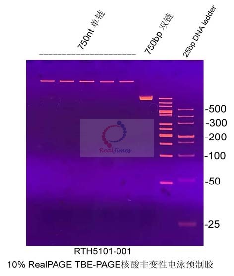 1.2 TBE- PAGE非变性电泳双链DNA Marker可以选择10 bp DNA ladder(10-100 bp)(货号:RTM443)或20 bp DNA ladder(20-500 bp)(货号:RTM441)或25 bp DNA ladder(25-500bp)(货号:RTM444)作为分子量标准;单链DNA Marker可以选择单链DNA Marker(20-75 nt)非预混型(货号:RTM507)或单链DNA Marker(10-75 nt)非预混型(货号:RTM509)。