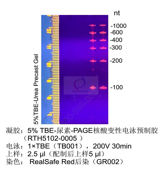 该Marker适用于非变性琼脂糖电泳,甲醛变性琼脂糖电泳以及TBE尿素变性PAGE电泳,电泳后可以使用核酸染料如RealSafe