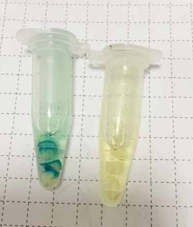 ml 离心管,编号GUS和CK(对照组)。顺序加入1 ml GUS染色缓冲液和20 μl X-gluc溶液(注意X-gluc溶液颜色,正常颜色为无色,如果溶液变红,说明溶液失效),混匀。