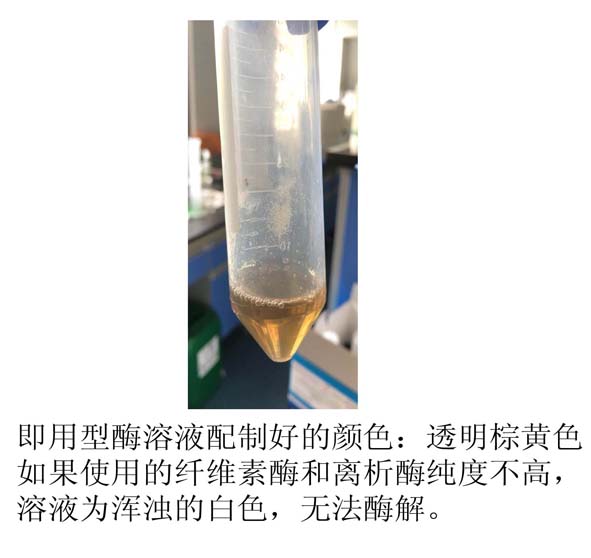溶解好的正常酶溶液应为澄清棕黄色溶液,如使用纯度不好的酶,溶液为不溶解的乳白色悬浊液,不能使用。