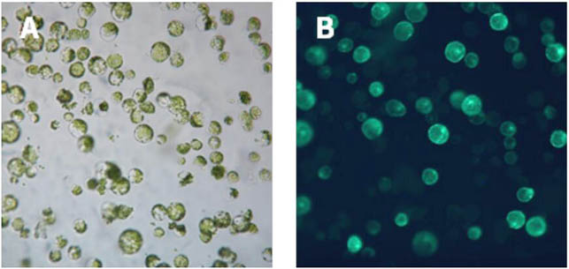 注:酶解时间与叶片种类,叶片生长状态有关,请根据实验需要适当调整酶解时间。3小时为拟南芥叶片推荐的酶解时间。如条件允许,可以使用微型真空泵常温避光条件下抽真空30 min,以使酶溶液更好地进入细胞间隙。酶溶液变为绿色表明有原生质体已经有分离,溶液为浓绿色表明原生质体已经大量分离。拟南芥原生质体大小约为30-50 μm,显微镜镜检后确定是否分离。叶片原生质体细胞显微镜下为绿色圆球状,叶绿体分散在整个细胞内,说明状态较好;如呈现不规则形状,说明原生质