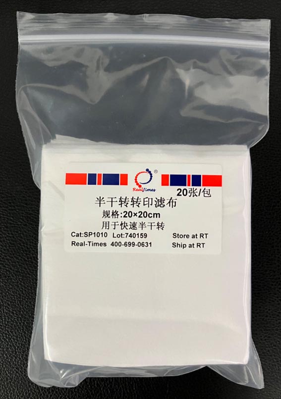 本转印滤布可以耐受用于蛋白印迹中的甲醇、乙醇及其它有机试剂。滤布展开大小为20×20 cm,无需自行裁切,根据需要可以自由折叠为使用的厚度,使用方便。