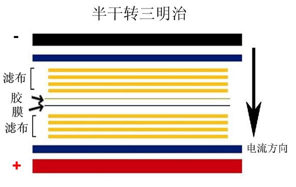 1. 将滤布折叠成10×10 cm大小(四层),镊子夹取折叠好的滤布在转膜缓冲液中浸湿3-5分钟,按照下图制作转印三明治,正负极各放置一张折叠好的滤布。