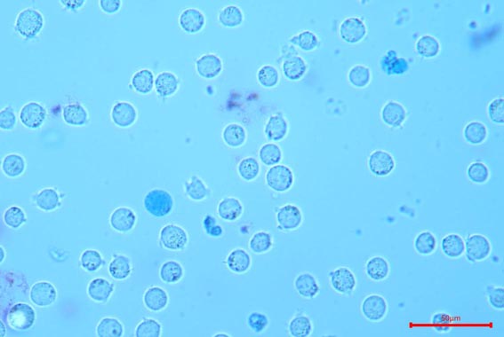 Jurkat细胞台盼蓝染色结果,深蓝色细胞为死细胞