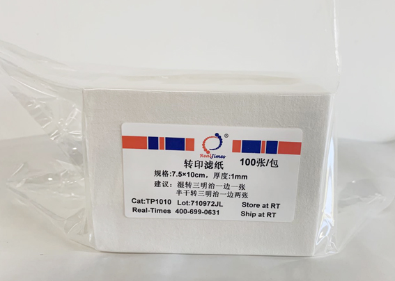 Paper for Blotting Transfer)是一种预裁切的可以直接用于Western、Northern、Southern、EMSA等蛋白或核酸转印的滤纸。本转印滤纸的材质为100%纯度的棉纤维素,不含任何添加剂,表面平整,质地均一,不含任何干扰实验结果的杂质,结果重现性好。本转印滤纸可以耐受用于蛋白和核酸印迹中的甲醇、乙醇及其它有机试剂。滤纸厚度为1 mm,预切割为7.5×10cm大小,无需自行裁切,使用方便。