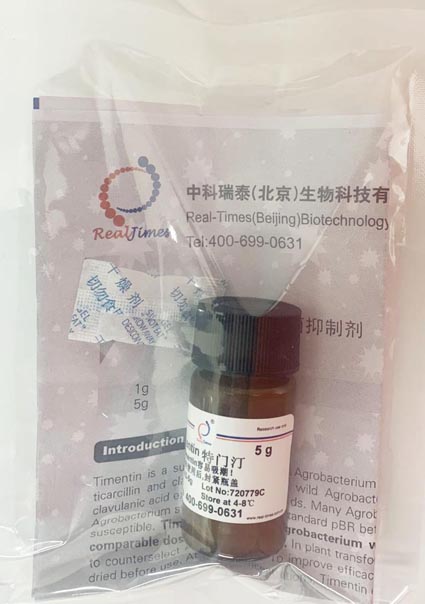 Potassium),按有效酸计,替卡西林钠与克拉维酸钾的配比为15:1,替卡西林是青霉素类杀菌试剂,而克拉维酸则是一种不可逆性高效β-内酰胺酶抑制剂。多种革兰氏阳性菌(G+)和阴性菌(G-)都能产生β-内酰胺酶,这类酶能在青霉素作用于病原体之前将其破坏。克拉维酸通过阻断β-内酰胺酶破坏细菌的防御屏障,恢复替卡西林敏感性。克拉维酸钾单独抗菌作用甚微,但与替卡西林配置后使本品成为具有广谱杀菌作用的抗生素,适用于对广泛的细菌感染性疾病的经验治疗。在科研中常用于抑制农杆菌生长,特别在胚性愈伤组织再生系统中,能达到很好的抑菌和再生效果。