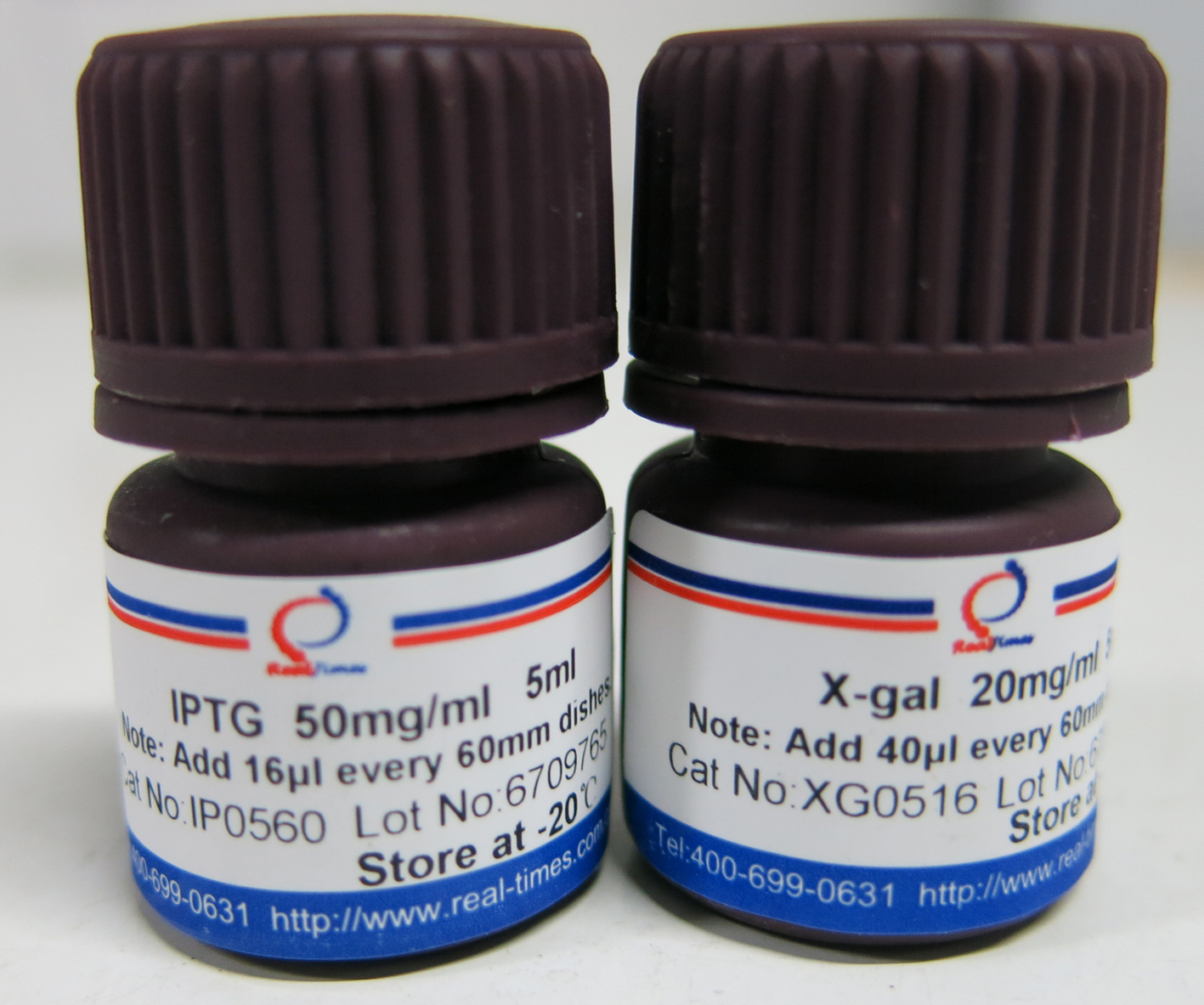 X-Gal 5ml:取100mg X-gal,溶于5ml 二甲基甲酰胺(DMF),棕色瓶中-20℃贮存。此试剂无需灭菌。