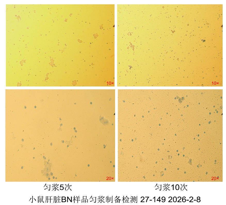 μl匀浆后的样品,加入等体积的台盼蓝溶液,混匀,在显微镜下观察台盼蓝溶液染色阳性(蓝色)细胞数目的比例,当阳性(蓝色)细胞破碎达到80%即可停止匀浆,请勿过度匀浆。若阳性(蓝色)细胞比例未达到80%,适当增加1-2次匀浆,随后按照同样的方法使用台盼蓝溶液进行鉴定。